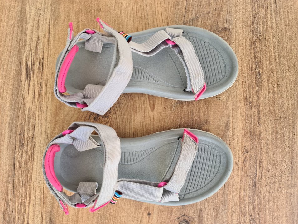 Gri renkte, çok renkli detaylara sahip, velcro bantlı, bohem tarz dolgu topuklu kadın sandaletleri. Kauçuk malzemeden, dış mekan kullanımı için uygundur.