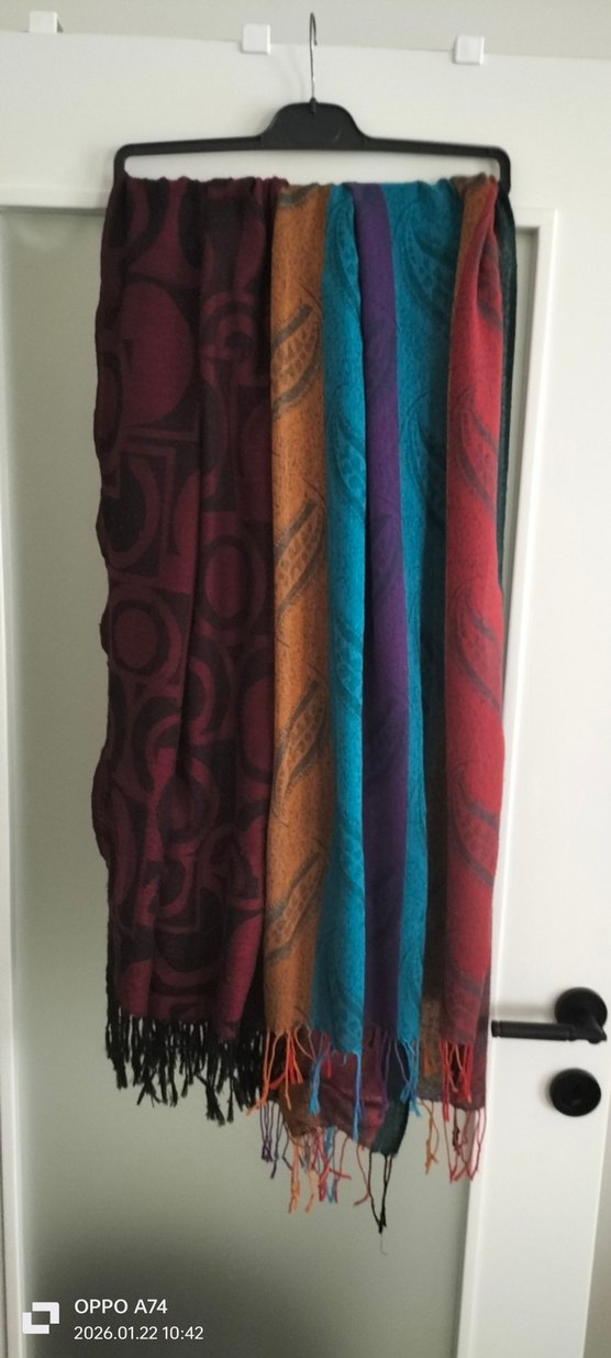 2 adet şal. Kadınlar için çok renkli, koyu tonlarda tekstil kumaştan drape şal. Rahat ve bohem tarzda, retro ve hippie esintili. Bordo olanda tiftiklenme vardır.
