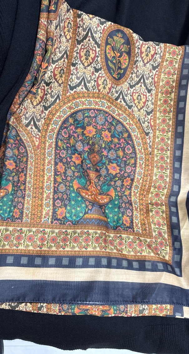 Kadınlar için çok renkli, koyu tonlarda bohem desenli tekstil kumaş şal. Çiçek ve tavuskuşu motifleriyle drapeli tasarım sunar.