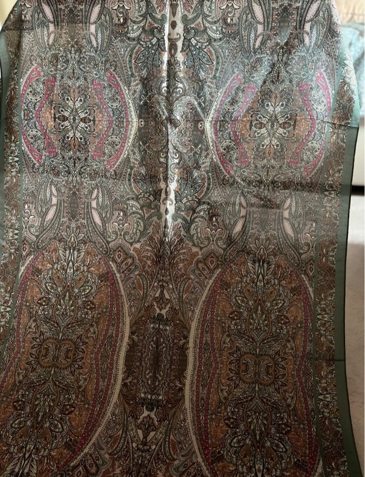 Kadınlar için çok renkli, koyu tonlarda bohem desenli, ipeksi dokulu ve drapeli şal.