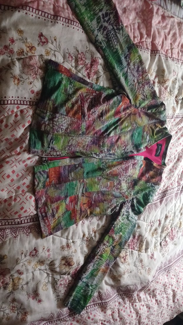 Kadınlar için çok renkli tie-dye desenli, bol kesim, uzun kollu, V yakalı ve fermuarlı sentetik kumaş midi ceket. Günlük kullanıma uygundur. yurt dışından hediye geldi tarzım değil o yüzden satışa koydum sayılı giyildi yeniden farkı yoktur