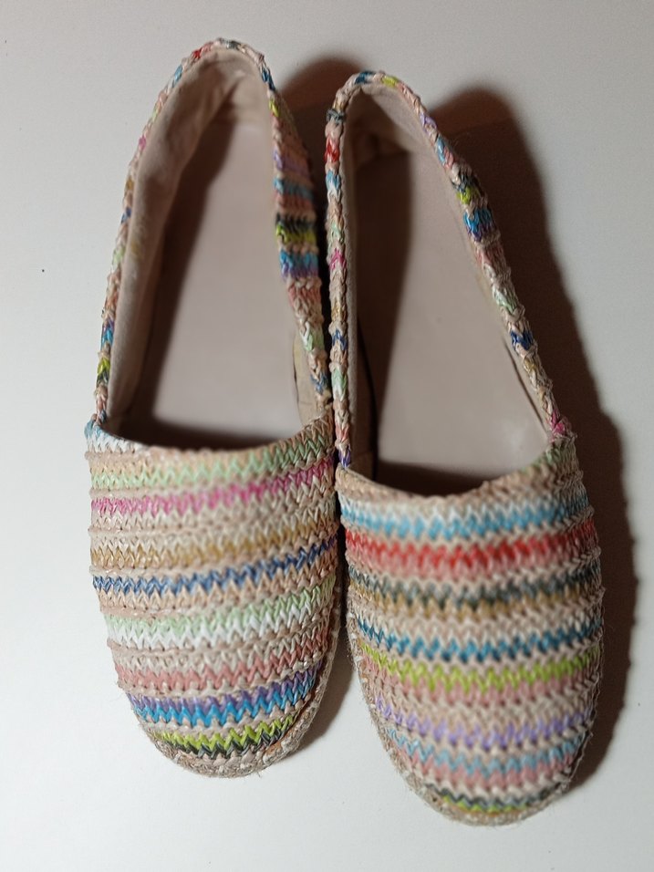 Kadınlar için çok renkli, pastel tonlarda örgü kumaştan yapılmış, espadril. Bohem tarzını yansıtan günlük kullanıma uygun ayakkabı. numarası 36 fakat 36,5 a da olur