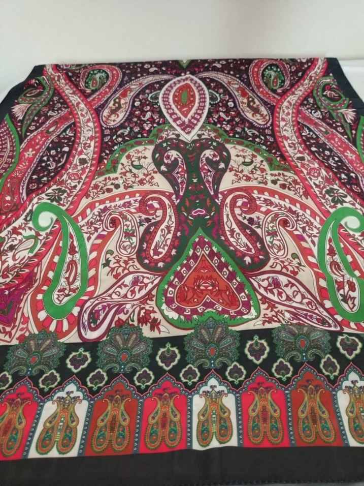 Kadınlar için çok renkli, koyu tonlarda bohem tarzda, drapeli şal. Sentetik kumaştan, hippie ve retro havası taşıyor.