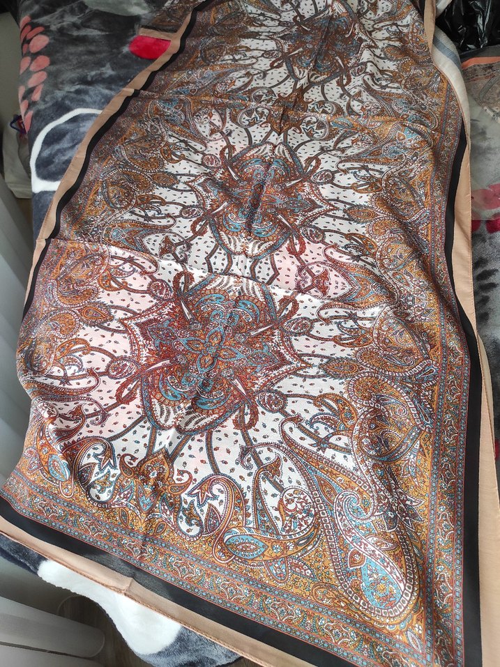 Kadınlar için çok renkli, koyu tonlarda bohem desenli, ipek dokulu şal. Rahat ve retro hippie tarzı için drapeli. soft şal