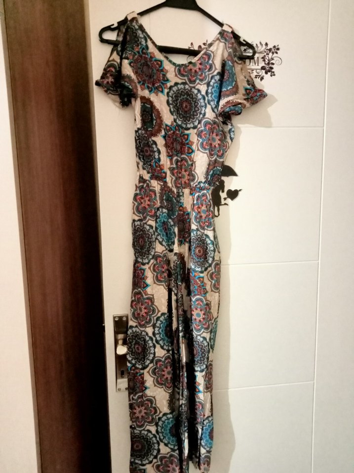 Kadınlar için uzun, bol kesim çok renkli tie-dye desenli tulum. askısız ve kolsuz tasarımıyla bohem tarzını yansıtıyor.