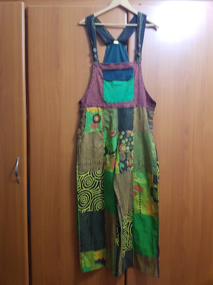 Kadınlar için uzun, bol kesim, askılı ve tokalı tulum. Tekstil malzemeden, koyu çok renkli batik patchwork deseniyle bohem tarzını yansıtıyor. Kolsuz, günlük kullanım için uygundur. m uyumlu
