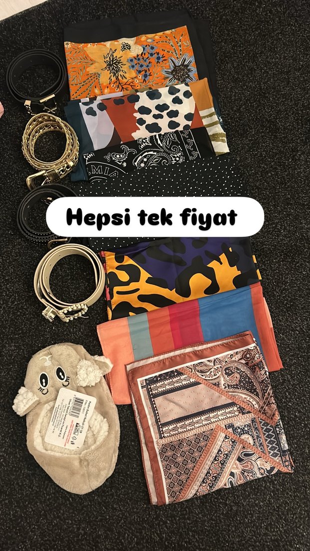 Kadınlar için çok renkli, koyu tonlarda bohemiyen desenlere sahip, cırt cırtlı tekstil fular. Yumuşak dokuludur. Üzerinde "Hepsi tek fiyat" yazısı bulunur. Hepsi gönderilecek