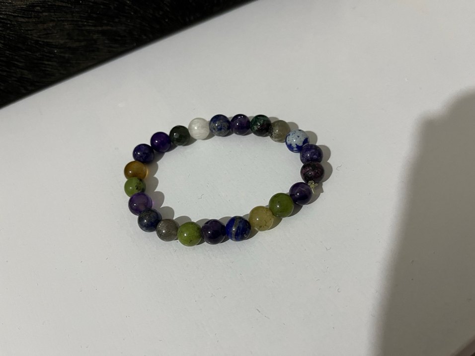 Koyu tonlarda çok renkli, bağlama desenli boncuklardan oluşan, bohem ve minimalist tarzda günlük kullanıma uygun bileklik.