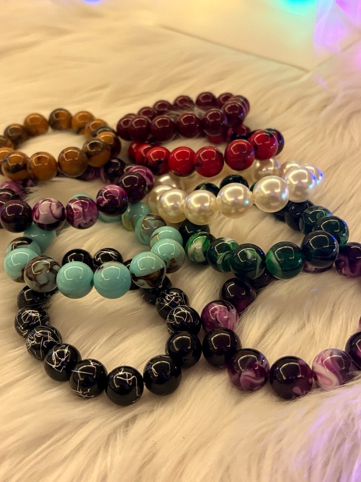 Çok renkli boncuklardan oluşan, bohem tarzda tie-dye desenli bileklikler. Günlük kullanıma uygun retro hippie şıklığı sunar.