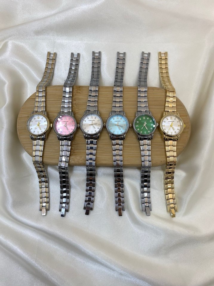 Kadınlar için farklı açık renklerde boncuklu metal kayışlı klasik ve çağdaş tarza sahip saatler. ⌚