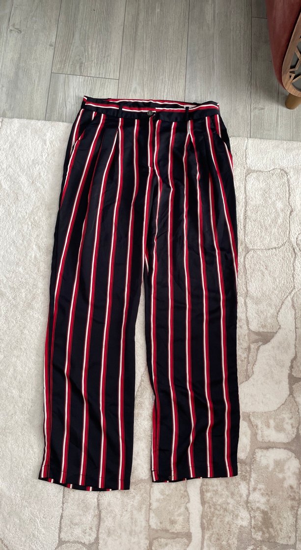 Kadınlar için bol kesim, pilili ve çok renkli dikey çizgili kumaş pantolon. Midi boy, günlük kullanıma uygun.