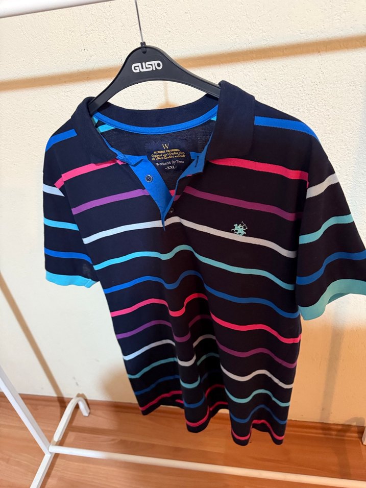 polo tişört, yakalı ve kısa kollu, bol kesim. Çok renkli yatay çizgiler ve düğmeli detaylar, sentetik kumaştan, günlük sokak stili için uygundur.