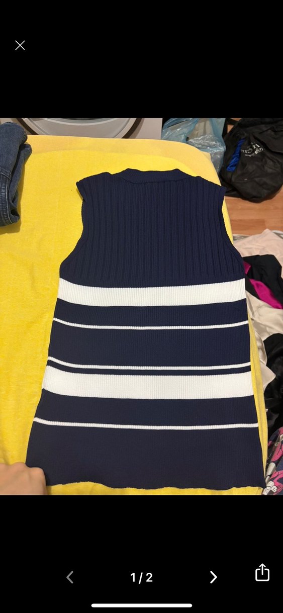 , kolsuz, vücuda oturan uzunlukta çok renkli çizgili triko süveter, sentetik kumaştan örülmüştür. Günlük rahat kullanım için uygundur.