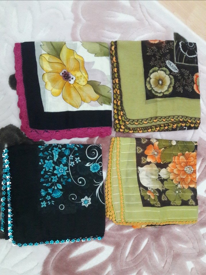 Kadınlar için çok renkli tekstil kumaştan, dantel detaylı eşarplar. Canlı koyu renkler ve çiçek desenleri bohem ve retro tarzı yansıtıyor. Tane fiyatı mevcuttur