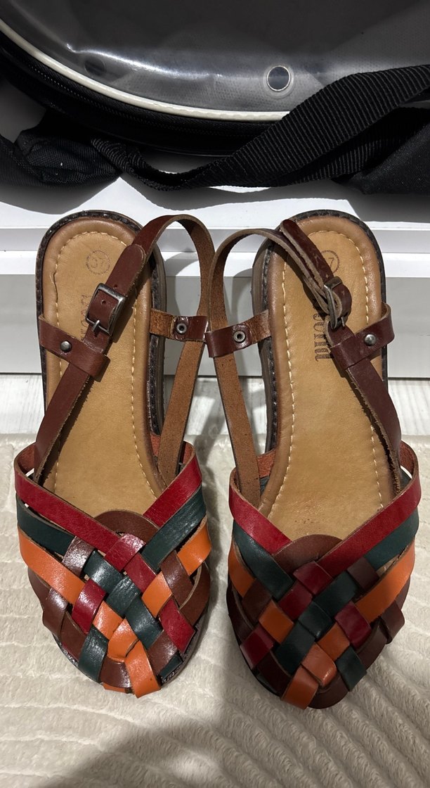 Kadınlar için çok renkli deri üstü, dokuma tasarım ve ayarlanabilir tokalı kayışlı sandalet. Rahat dolgu topuklu, günlük kullanıma uygun bohem tarzda.