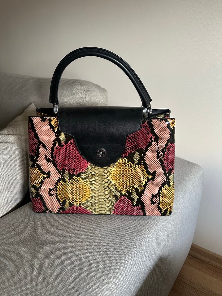 Kadın deri yılan desenli, çok renkli ve koyu tonlarda, tokalı kapaklı, günlük kullanıma uygun çanta.