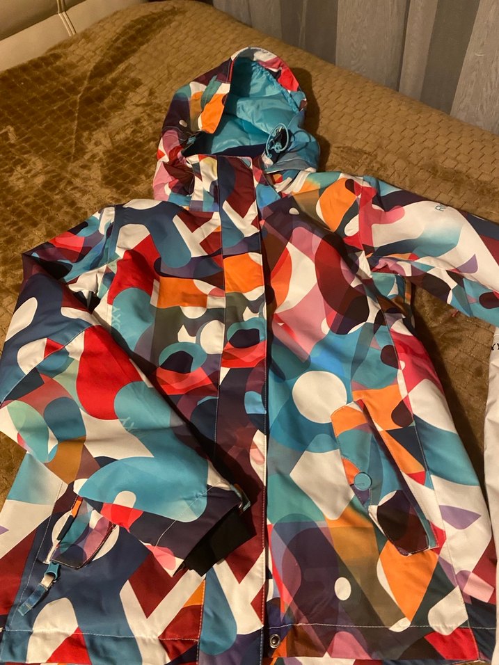 Kadınlar için bol kesim, midi boy ve kapüşonlu. Canlı çok renkli desenli, kürk detaylı, sentetik kumaştan sokak stili mont.