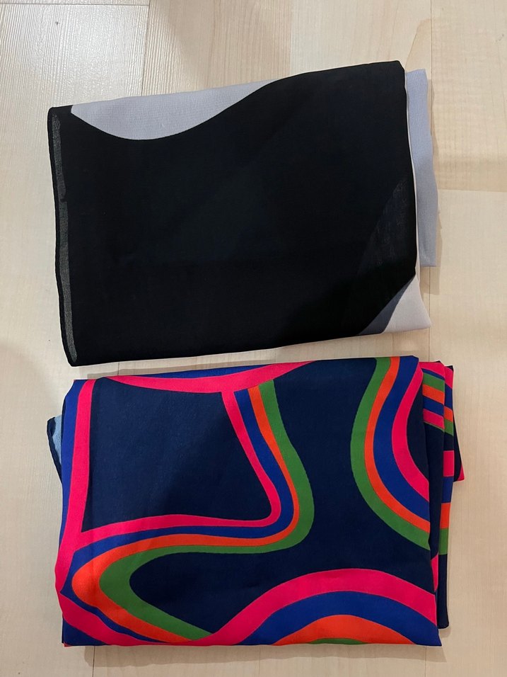 Diger markasına ait, yumuşak sentetik kumaştan yapılmış, koyu ve canlı çok renkli, drape tarzda kadın şalı. Çağdaş avangard stil. Adet 100 tl