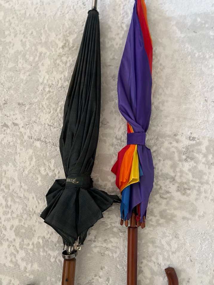 Kadın çok renkli, drapeli şemsiye; koyu tonlarda, gotik ve Parisli avangart stilini yansıtıyor. Siyah olanda ufak bir defo var ancak çalışır vaziyette
