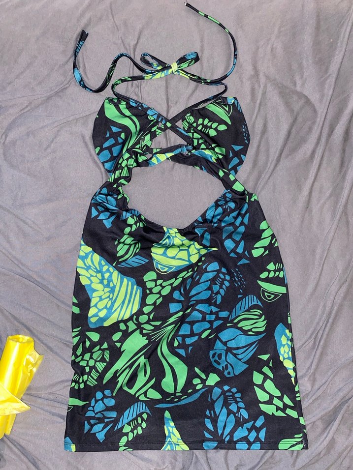 Drapeli, çok renkli bağlamalı, uzun boy, dar kesim, kolsuz kadın monokini, dış mekan için avant-garde tarzda. Elbise olarak da giyebilirsiniz.