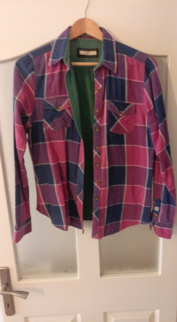 Kadınlar için düğmeli, uzun kollu, yakası kesik ve bol kesim çok renkli vintage tarzda gömlek. Günlük kullanım için uygundur.