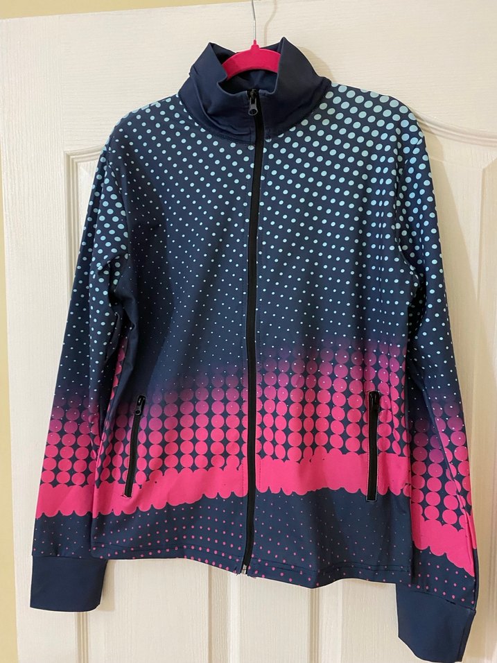 Kadınlar için fermuarlı, yüksek yakalı ve uzun kollu, sentetik kumaştan yapılmış, çok renkli noktalı desenli, sportif ve şık bir ceket.