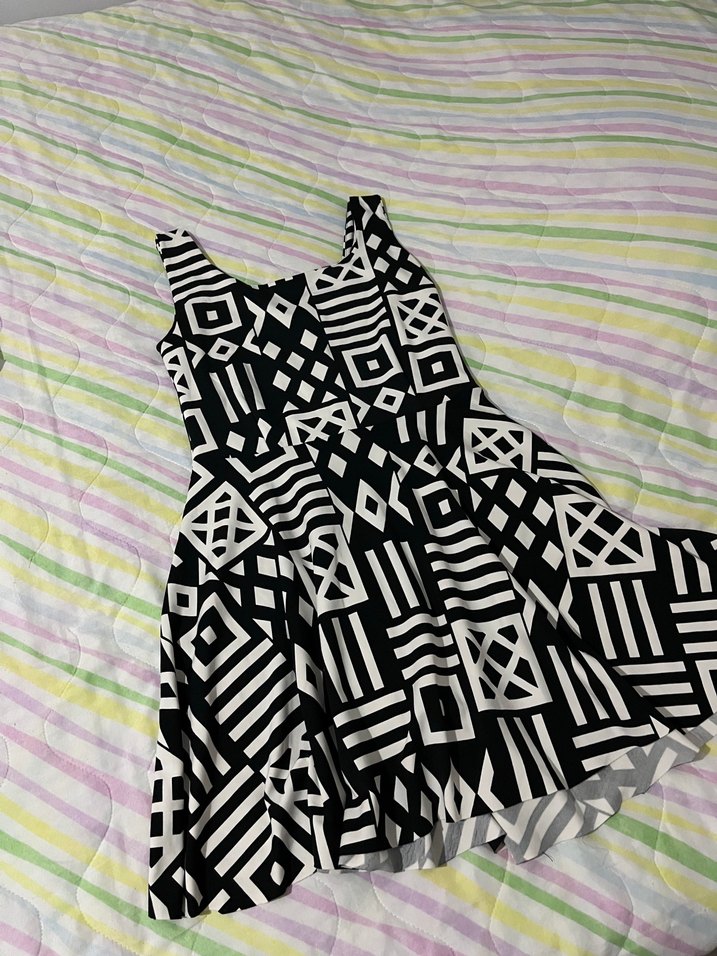 Kadınlar için çok renkli geometrik desenli, uzun, pileli ve ince askılı esnek elbise. Sentetik kumaştan yapılmıştır ve sokak modasına uygundur.