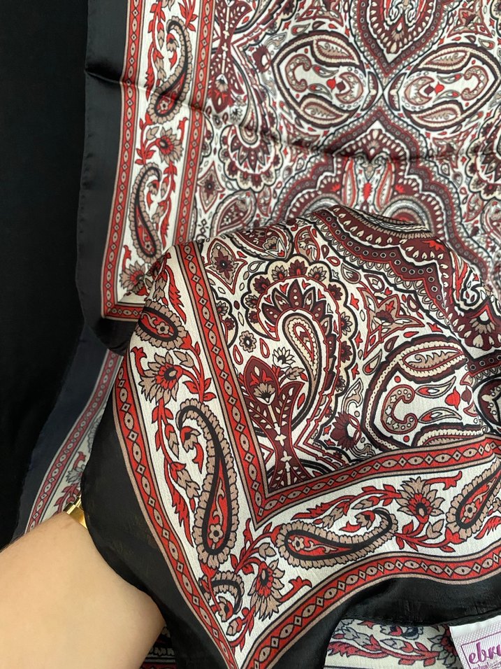 Kadınlar için çok renkli, koyu tonlarda bohem desenli, ipek görünümlü ve drapeli şal. Retro ve klasik tarzda.