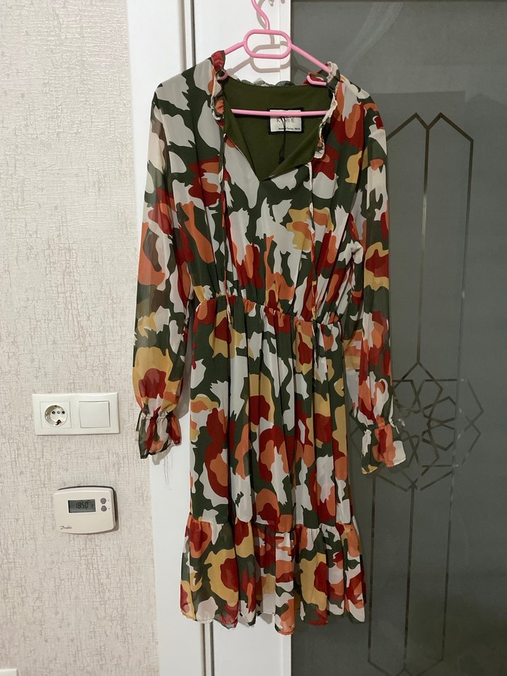 Kadınlar için kamuflaj desenli midi elbise, bol kesim, uzun kollu ve V yakalıdır. Hafif sentetik kumaştan yapılmış, fırfır detaylarıyla bohem tarz sunar.