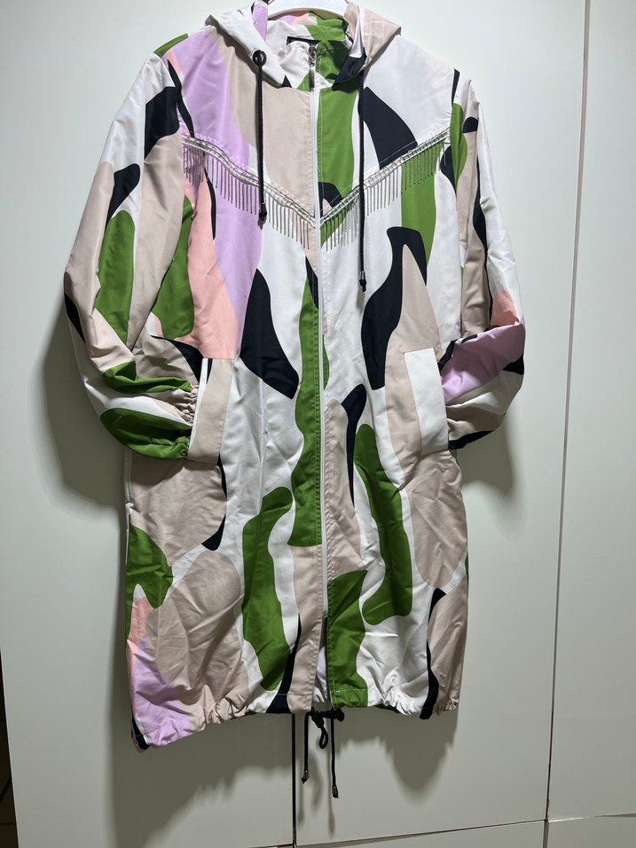 Kadınlar için kapüşonlu, uzun kollu, pastel kamuflaj desenli bol kesim yağmurluk. Fermuarlı ve günlük sokak stiline uygun athleisure tasarım.