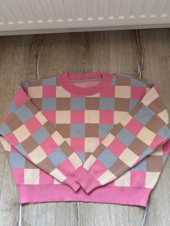 Yumuşak triko kumaştan örülmüş, çok renkli pastel kare desenli, bol kesim kadın kazak. Yuvarlak yaka ve uzun kolludur, rahat sokak stiline uygundur.