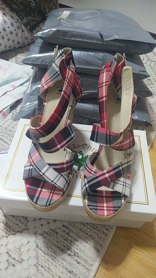 Kadınlar için çok renkli kareli desenli, tokalı bantlara ve kauçuk tabana sahip dolgu topuklu sandaletler, gündelik kullanım için uygundur.