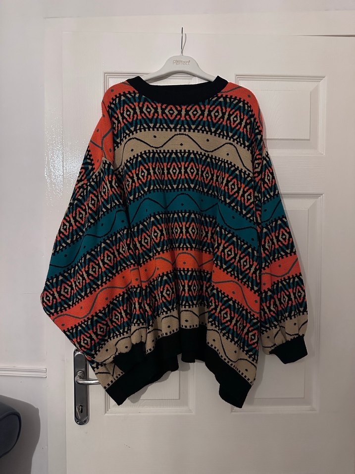 Uzun kollu ve yuvarlak yakalı, oversize çok renkli desenli kazak. Günlük kullanıma uygun, rahat ve retro görünüm sunar.