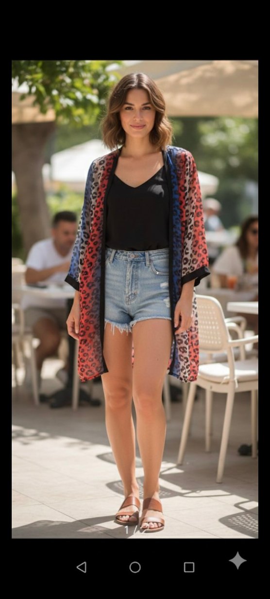 Kadınlar için çok renkli tie-dye desenli, kısa boy, bol kesim denim kimono. Kısa kollu ve dökümlü yapıda, günlük sokak stili için uygun.