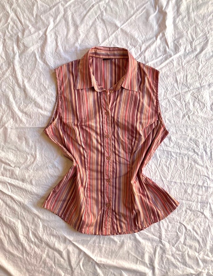 Kolsuz ve yakalı gömlek, pastel çok renkli. Bohem ve vintage tarzda, vücuda oturan kesime sahip. Buradan aldım ve kullanmadım.