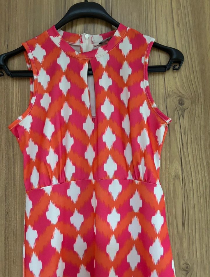 Kadın kolsuz, çok renkli tie-dye desenli tulum, yakasında küçük bir pencereyle şık bir dekolte vermektedir. Sentetik kumaştan, fermuarlı ve günlük kullanım için uygundur.