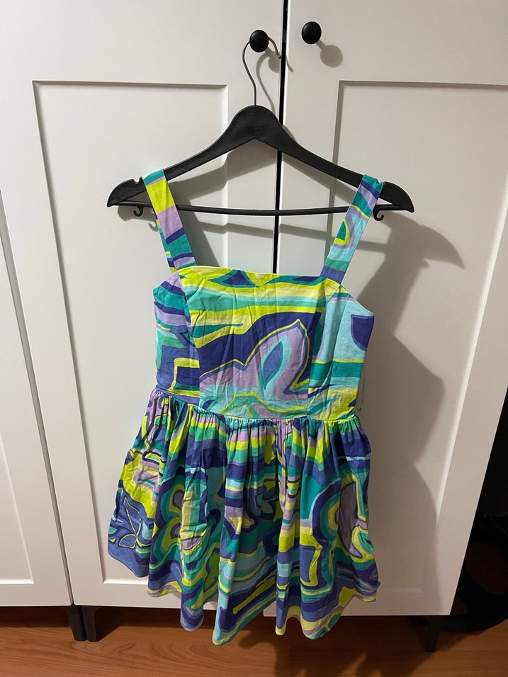 Askılı, mini boy, çok renkli tie-dye desenli, drapeli, suni kumaştan, bohem ve retro tarzda parti elbisesi.