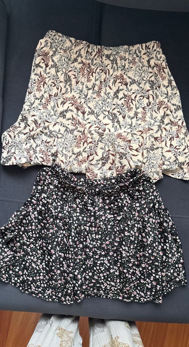 Bohem tarzda, volanlı, salaş kesim, koyu çok renkli çiçek desenli iki kadın mini eteği, günlük kullanıma uygun.