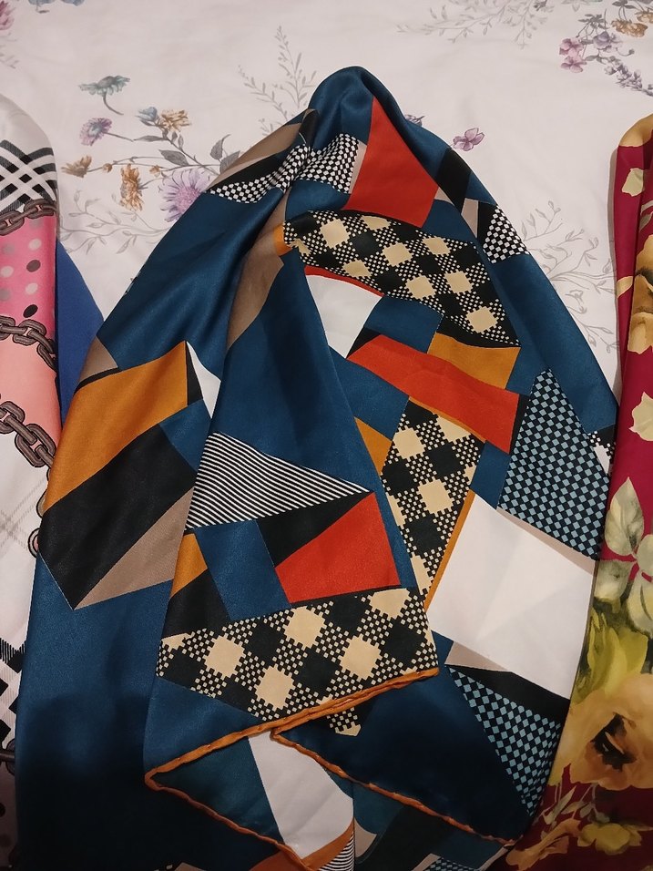 Kadınlar için çok renkli geometrik desenli, sentetik kumaştan drapeli modern fular.