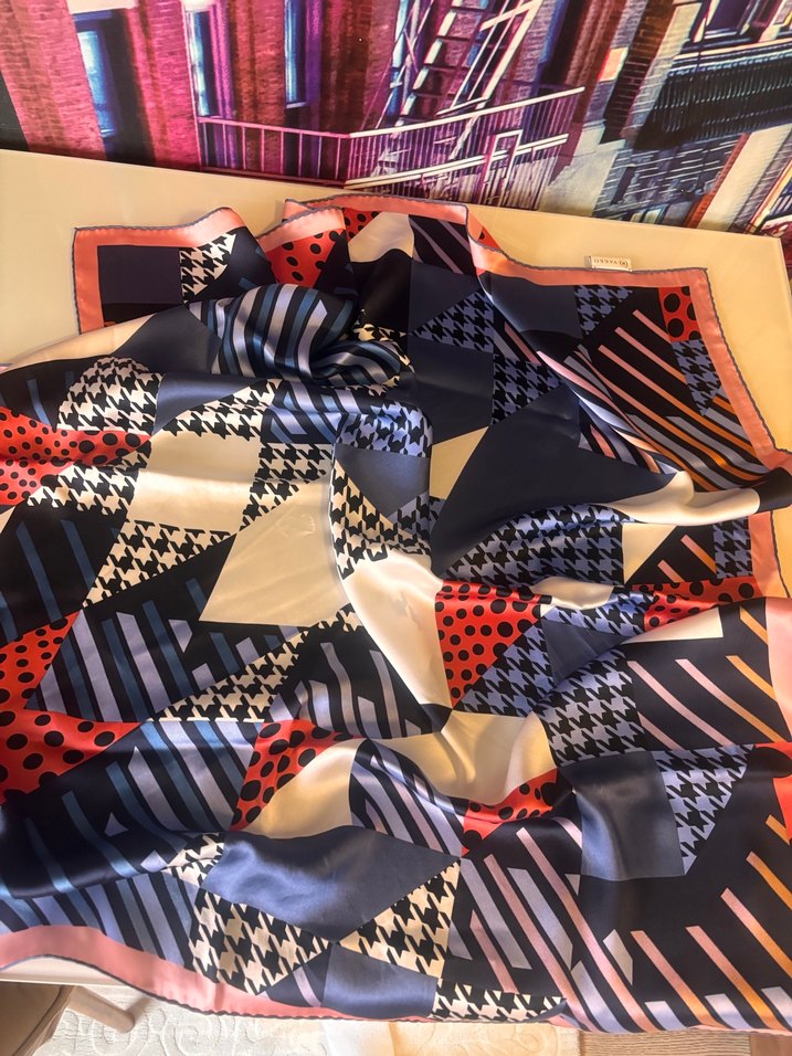 Kadınlar için çok renkli, koyu tonlarda modern desenli, sentetik kumaştan drapeli fular.