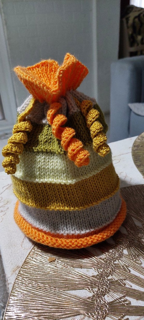 Kadınlar için çok renkli örgü bere, bohem tarzda. Yumuşak triko kumaştan üretilmiş, canlı renklerde kıvırcık örgü detaylar içerir.