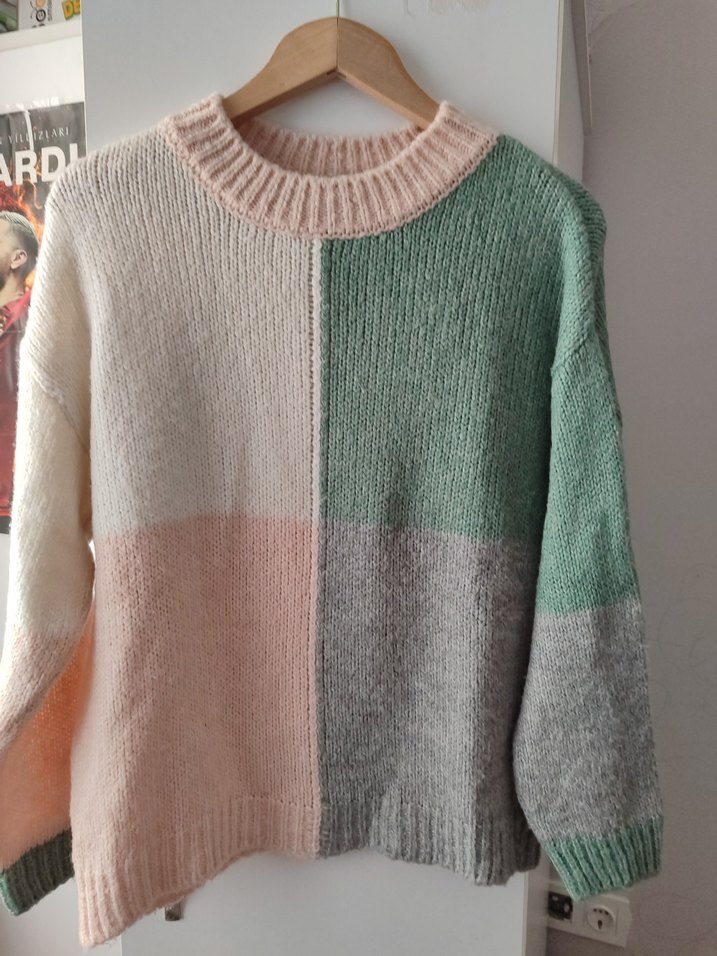 Kadınlar için çok renkli, örgü, bohem tarzda, yuvarlak yaka ve uzun kollu rahat kesim kazak. Pastel tonlarda, günlük kullanım için ideal.