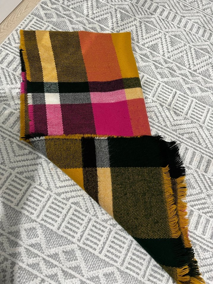 Kadınlar için örgü, çok renkli ve koyu tonlarda, bohem tarzda, sentetik kumaştan şal. Rahat ve retro-hippi havası vardır.