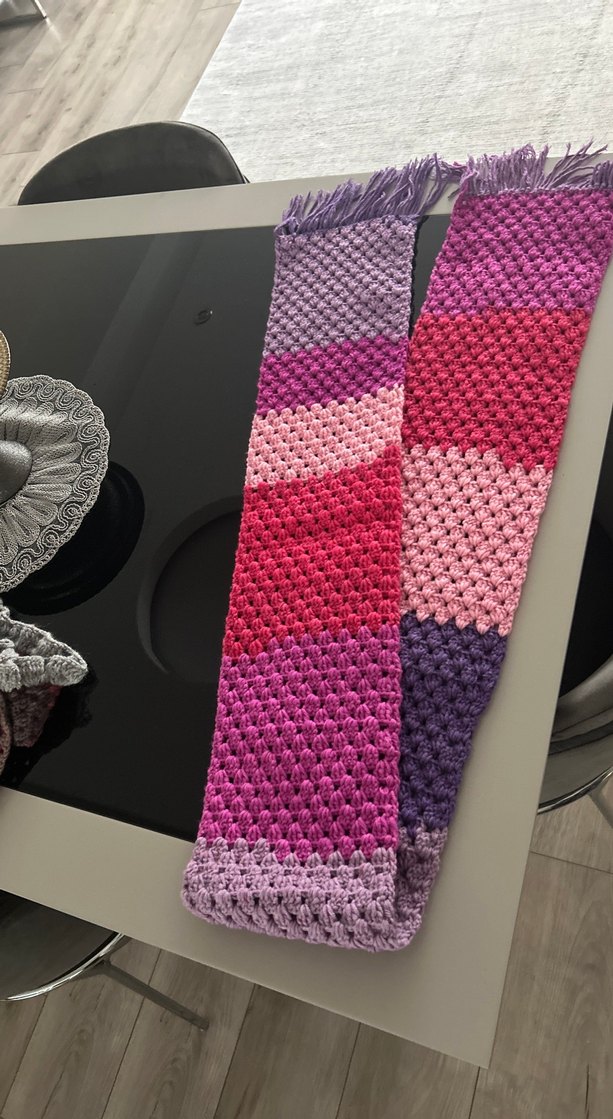 Kadınlar için çok renkli, örgü dokulu, bohem tarzda rahat bir şal. Mor, pembe ve kırmızı tonlarında canlı ve koyu renkler içerir.