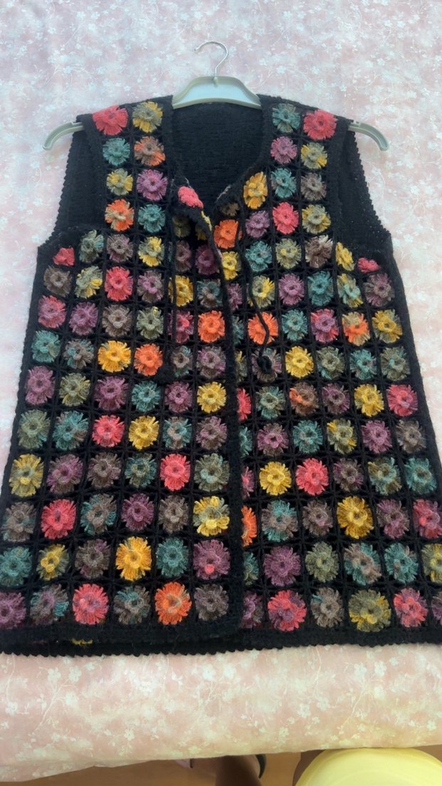Kadınlar için çok renkli, örgü, kolsuz, bol kesim ve yuvarlak yakalı bohem tarzda yelek. Günlük kullanıma uygun, rahat bir modeldir.