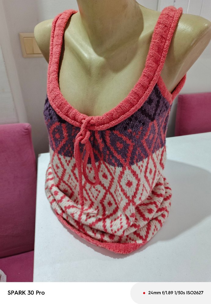 Renkli batik desenli, örgü, kolsuz halter yaka kadın yelek. Salaş kesim ve mini boy, rahat ve bohem tarz için uygun.