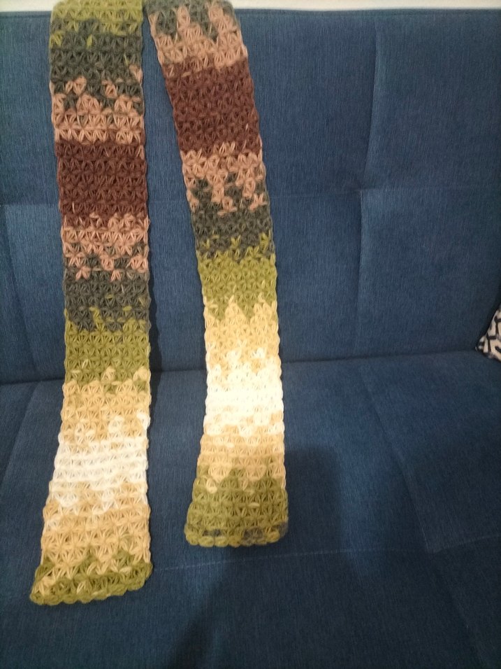 Kadınlar için örgü şal, koyu tonlarda çok renkli ve bohem tarzda rahat bir desene sahip. Toprak tonlarıyla retro ve hippie havası verir.