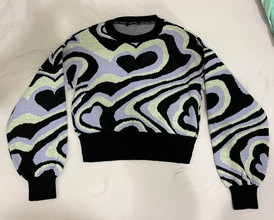 Kadın çok renkli örgü kumaştan, bağlama desenli uzun kollu kazak. Salaş kesimli, yuvarlak yaka ve rahat bohem tarzda.