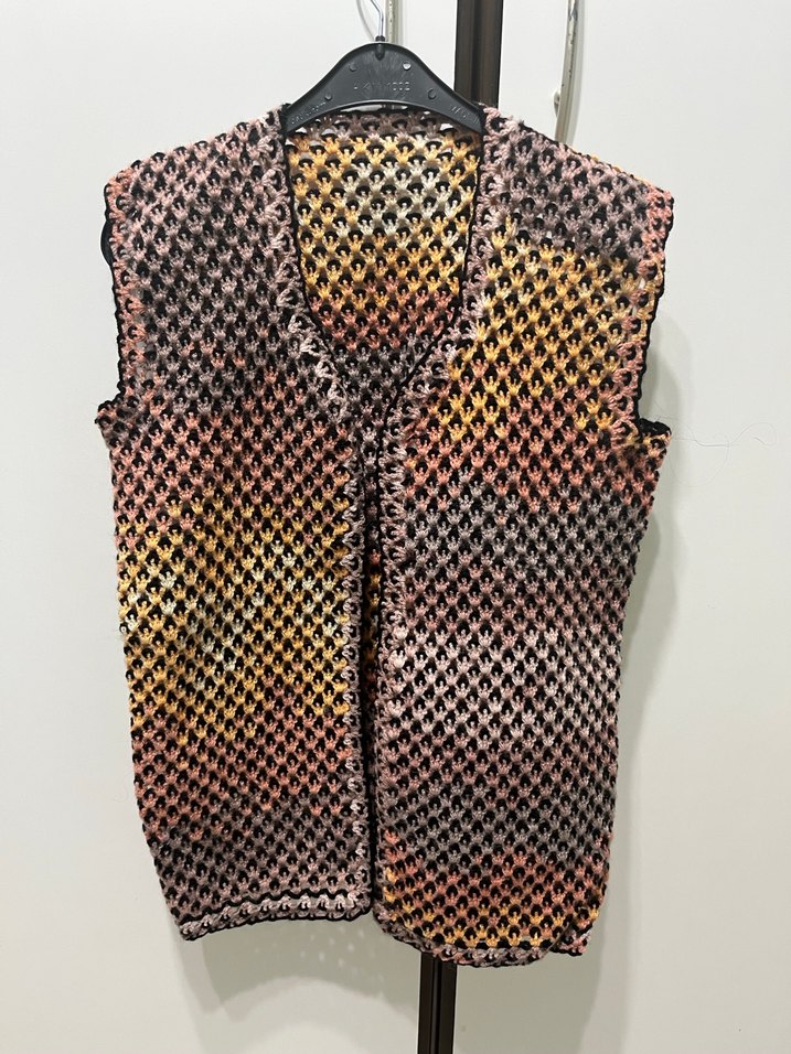 Kadınlar için örme dokulu, koyu çok renkli batik desenli kolsuz yelek. Normal kesim ve boğazlı yakaya sahip, rahat ve retro tarzda, günlük kullanım için uygundur.