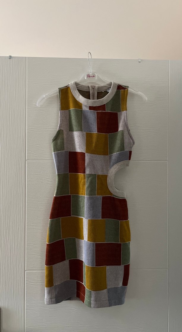 vücuda oturan kesime sahip çok renkli örme mini elbise, yan kısımda kesik detaylı 75 cm marka temsilidir